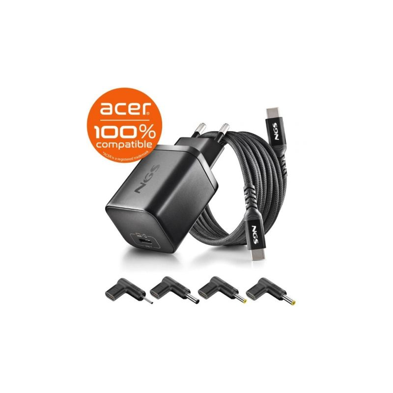 Cargador GaN de Portátil NGS BUD65W-AC para Acer/ 1xUSB Tipo-C/ 65W/ Automático/ 4 Conectores/ Voltaje 5-20V