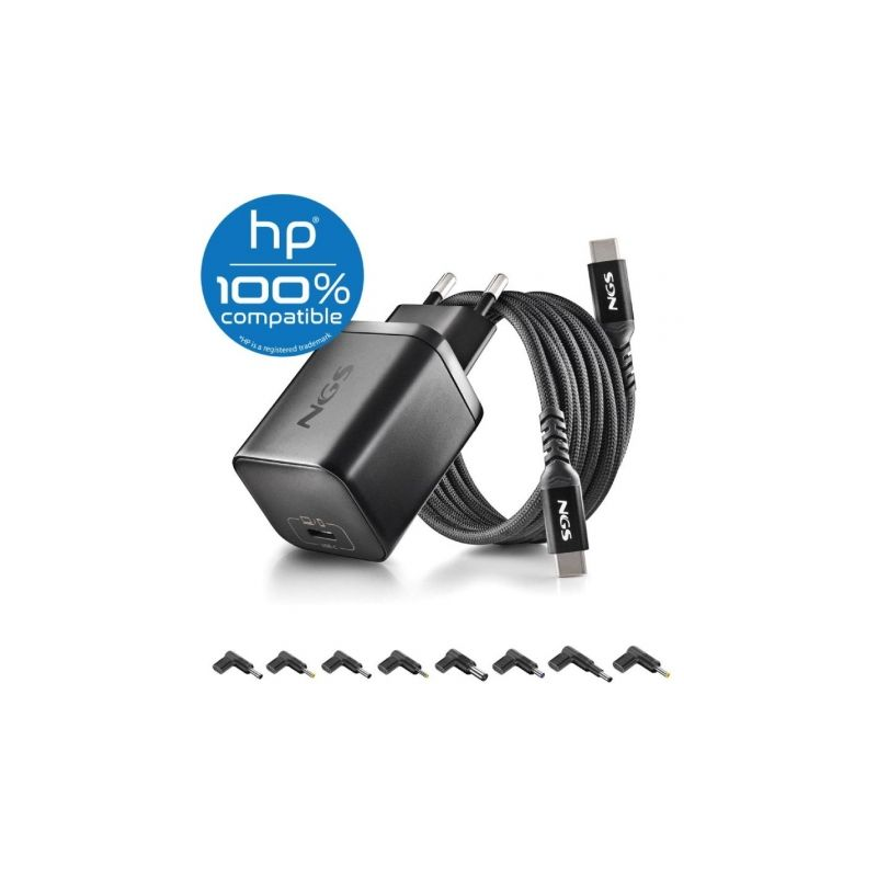 Cargador GaN de Portátil NGS BUD65W-H para HP/ 1xUSB Tipo-C/ 65W/ Automático/ 8 Conectores/ Voltaje 5-20V