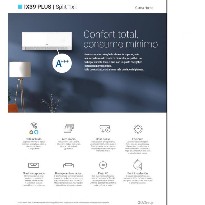 Aire acondicionado Split 1x1 HTW HTWS035IX39PLUS, 3000 Frig. A+++ , WiFi