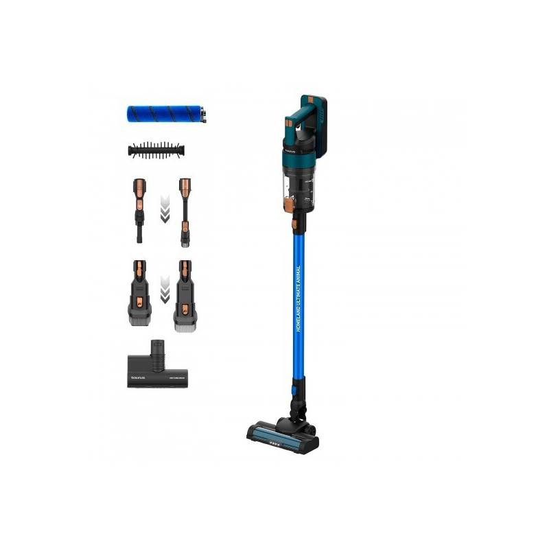 Taurus Homeland Ultimate Animal es una aspiradora sin cable ligera y manejable, con un peso de solo 2 kg, perfecta para una limpieza fácil ysin esfuerzo incluso en las áreas más difíciles de alcanzar, gracias a la iluminación OPTIC LED integrada que mejora la visibilidad en zonasoscuras. Equipado con un conjunto completo de accesorios, que incluye el cepillo motorizado ALL ROAD, adecuado para todo tipo desuperficies, y el Mini Turbo Brush, ideal para eliminar el pelo de mascotas, ofrece una limpieza versátil y eficaz. Su sistema de filtración ciclónicaavanzada, compuesto por un filtro HEPA, un filtro ciclónico y una malla protectora, garantiza un aire más limpio y un rendimiento duradero,capturando incluso las partículas más finas. Impulsado por una batería de litio extraíble de 33,6 V MAX, el Taurus Homeland Ultimate Animalofrece una autonomía de hasta 70 minutos en modo ECO y una carga rápida en solo 4 horas, maximizando la eficiencia de la limpieza. Con unapotencia de succión de 165 W y una fuerza de 12.500 Pa, es capaz de enfrentar incluso la suciedad más difícil en cualquier superficie, lo que lohace ideal para la limpieza diaria de suelos duros, alfombras y tejidos.